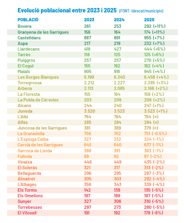 Si mirem a l'altra banda de la taula, als municipis que no guanyen població, les xifres d'aquest any també indiquen una certa contenció de les pèrdues. Molts pobles baixen lleugerament (un 1% o un 2%), alguns es mantenen igual i, en uns pocs casos, el descens és més acusat, però en cap cas superior al 7%. El Vilosell, el que més, perd un 6,8%, però cal tenir en compte també la particularitat d'aquest municipi, que es caracteritza per un elevat nombre de segones residències. És aviat per aventurar un canvi de rumb substancial en la demografia de la comarca, però qui sap si estem assistint als primers compassos d'un efecte Covid retardat, quan la pandèmia va posar en valor la vida als pobles. Era una posada en valor a nivell discursiu i des de la immediatesa del moment. A la pràctica, els canvis de fons són molt més lents.