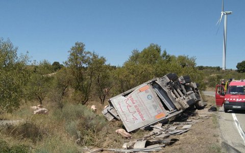 El vehicle, que anava carregat de porcs, ha sortit de la via a la C-242, a cinc quilòmetres del poble. El conductor ha estat traslladat a l'hospital Arnau de Vilanova de Lleida.