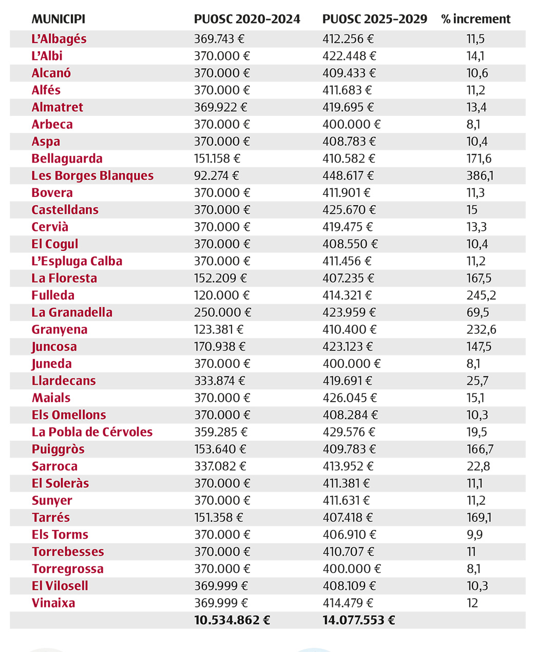 La convocatòria canvia una mica respecte a l'anterior. Fins ara, per exemple, hi havia dues línies d'ajut: una general d'inversions per a tots els municipis i consells comarcals i una d'específica per als de menys de 5.000 habitants. Amb la nova convocatòria, el pressupost es canalitza únicament per a la línia d'inversions i hi poden accedir tots els ens locals. Per als ajuntaments, la subvenció serà com a mínim de 400.000 euros, i en el cas dels consells comarcals, tindran un import fix de 512.195 euros. Abans, els municipis de més de 5.000 habitants (a les Garrigues només és el cas de les Borges) podien rebre un màxim de 250.000 euros, mentre que als de menys 5.000 habitants (tota la resta de la comarca) era de 370.000 euros. Ara tots en rebran, com a mínim, 400.000 [v. taula]. Segons el volum de població, això sí, el PUOSC podrà suposar un percentatge o un altre del cost total de l'obra. Per als de menys de 1.000 habitants pot ser del 95%; per als de 1.001 a 2.000, el 90%; per als de 2.001 a 5.000, el 80%; i per als de 5.001 a 10.000, el 75%.